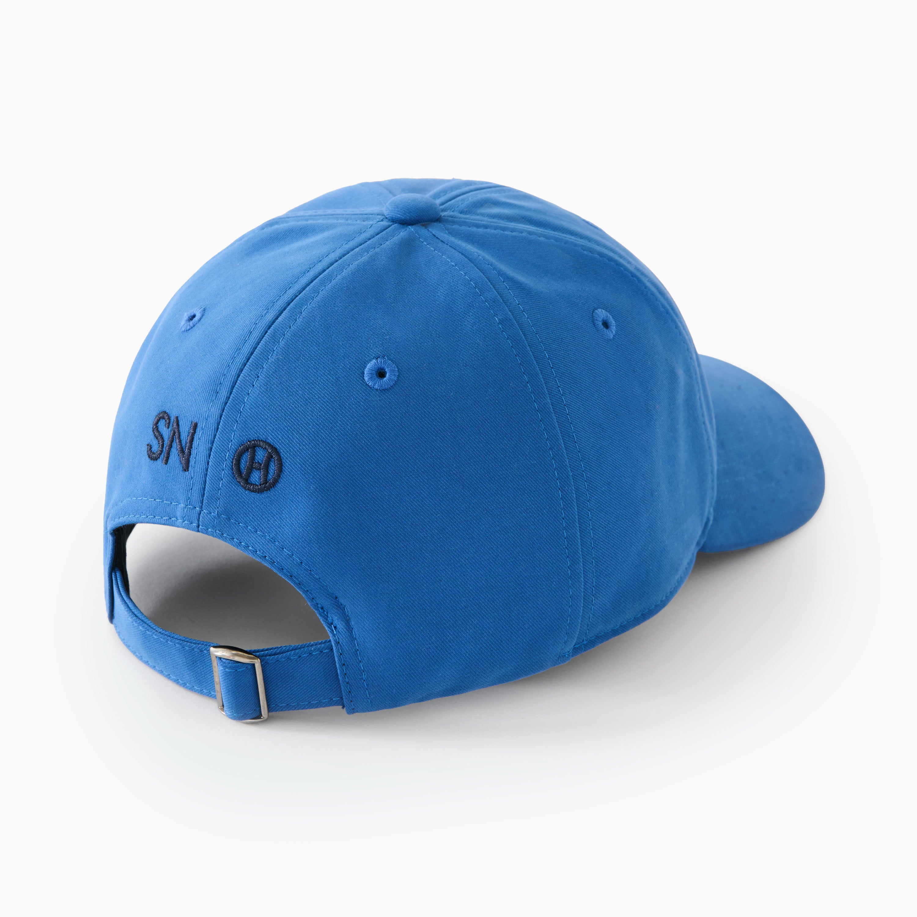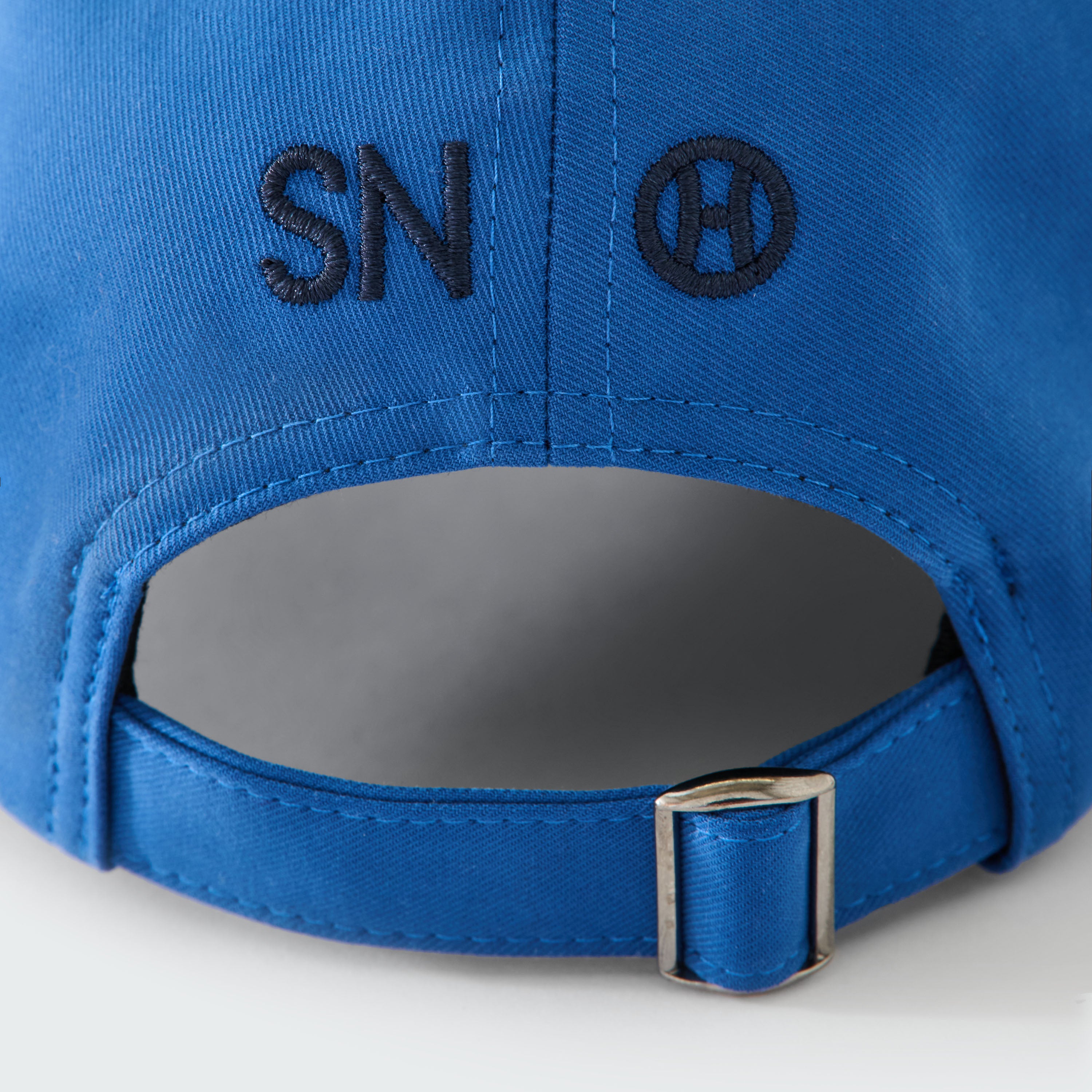 The 'true-blue' colour references traditional workwear and contrasts with the navy logo embroidery on the front and back. Italian cotton twill fabric is chosen for its tightly woven construction that provides excellent structure and durability. The surface is treated with a moleskin brushing process, creating a luxuriously soft, suede-like hand feel while maintaining the strength of the cotton.