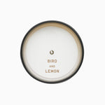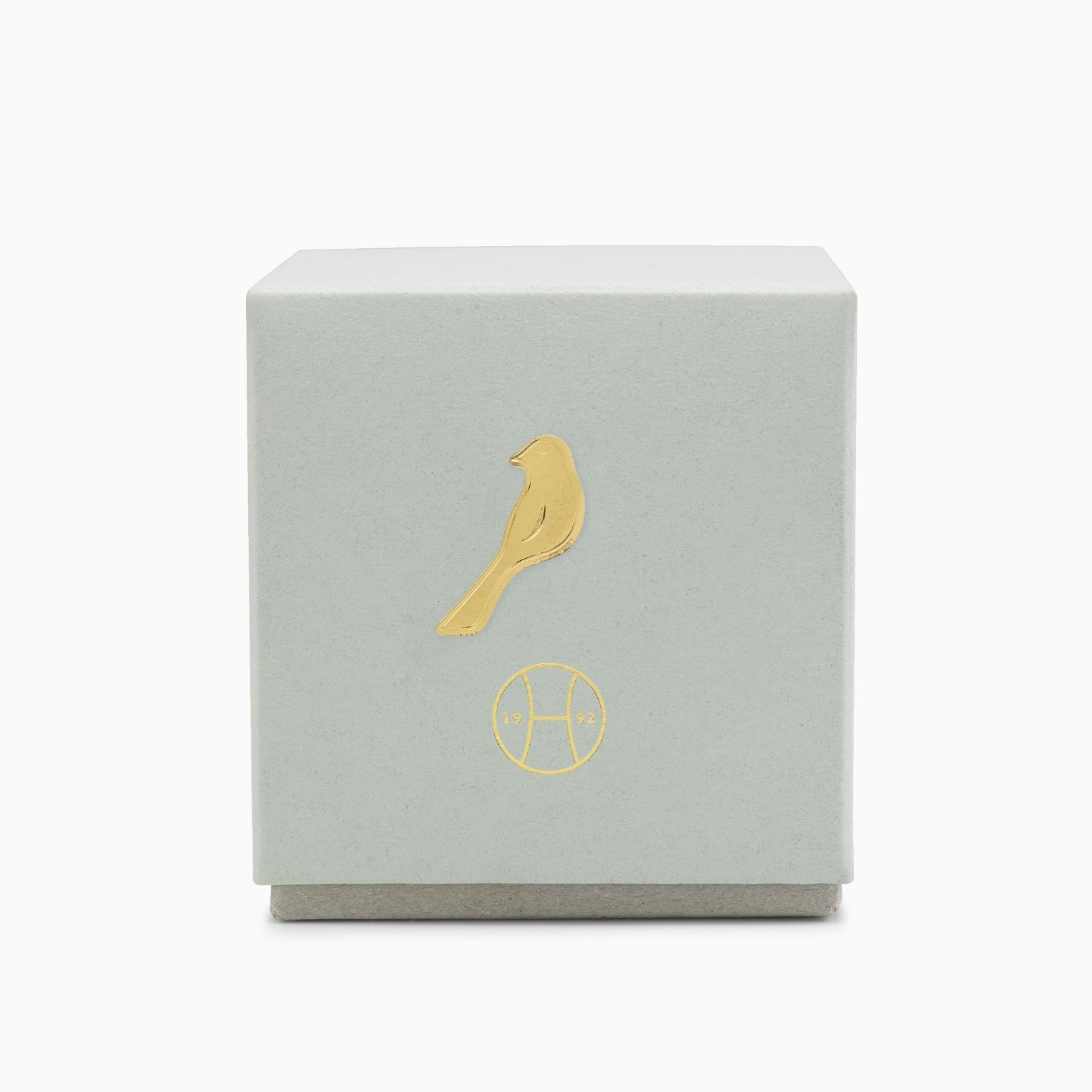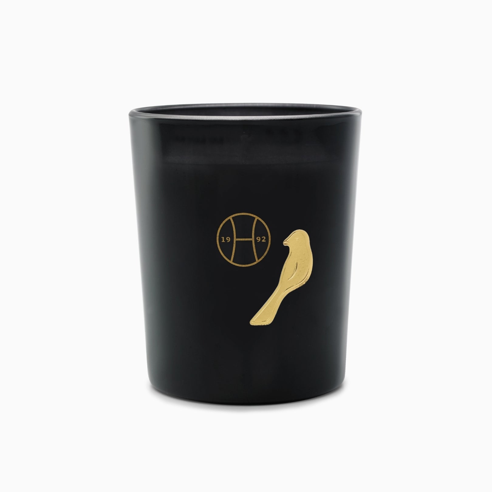 アイコニックなパフューマーHのユーティリティ・キャンドルは、ウィル・カルヴァーの「鳥とレモン」の絵と呼応するように、金色の鳥で飾られている。