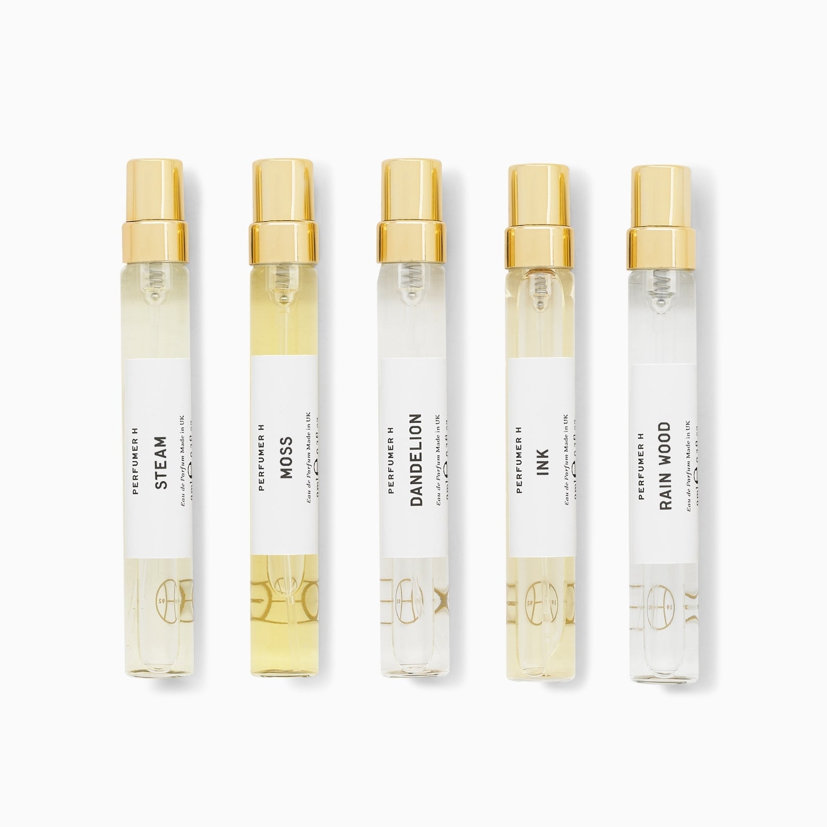 INK Eau de Parfum Elemi Iran, black pepper, rose absolute Turkey, vetiver Haiti, patchouli Indonesia, papyrus India, cedar wood Virginia, frankincense Somalia and ambroxan. RAIN WOOD Eau de Parfum Elemi Iran, galbanum, water lily, angelica grain, cedar wood Virginia, juniper wood, patchouli Indonesia, frankincense and myrrh. MOSS Eau de Parfum Bergamot Sicily, grapefruit, lavender France, mandarin Italy, pine needle Siberia, tree moss, vetiver Haiti, amber and sea moss. DANDELION Eau de Parfum Lemon Sicily, Orange Flower Absolute Tunisia, Mandarin Italy, Plum, Basil Leaf Egypt, Galbanum Iran, Cardamon, Vetiver Haiti, Sandalwood and Musk. STEAM Eau de Parfum Mandarin Italy, plum, green tea, coriander, black pepper, birch tar, cedar wood Virginia, juniper wood France, sandalwood.