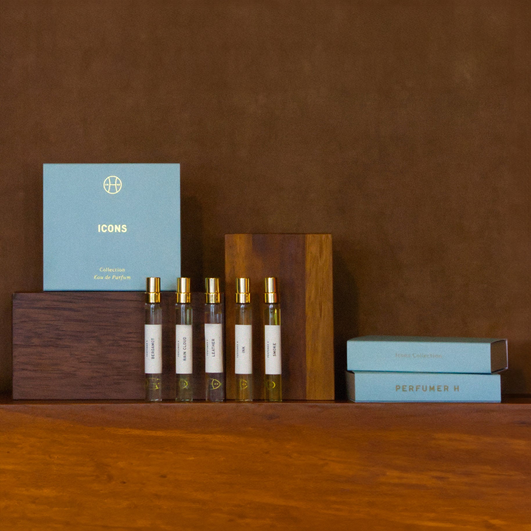 5つのフレグランスファミリーから、それぞれ最も人気の香りを選んだIconsコレクションは、白い紙に浮かぶ青いインクから、トロピカルな夏の雨雲まで、Perfumer Hのさまざまな世界への誘います。