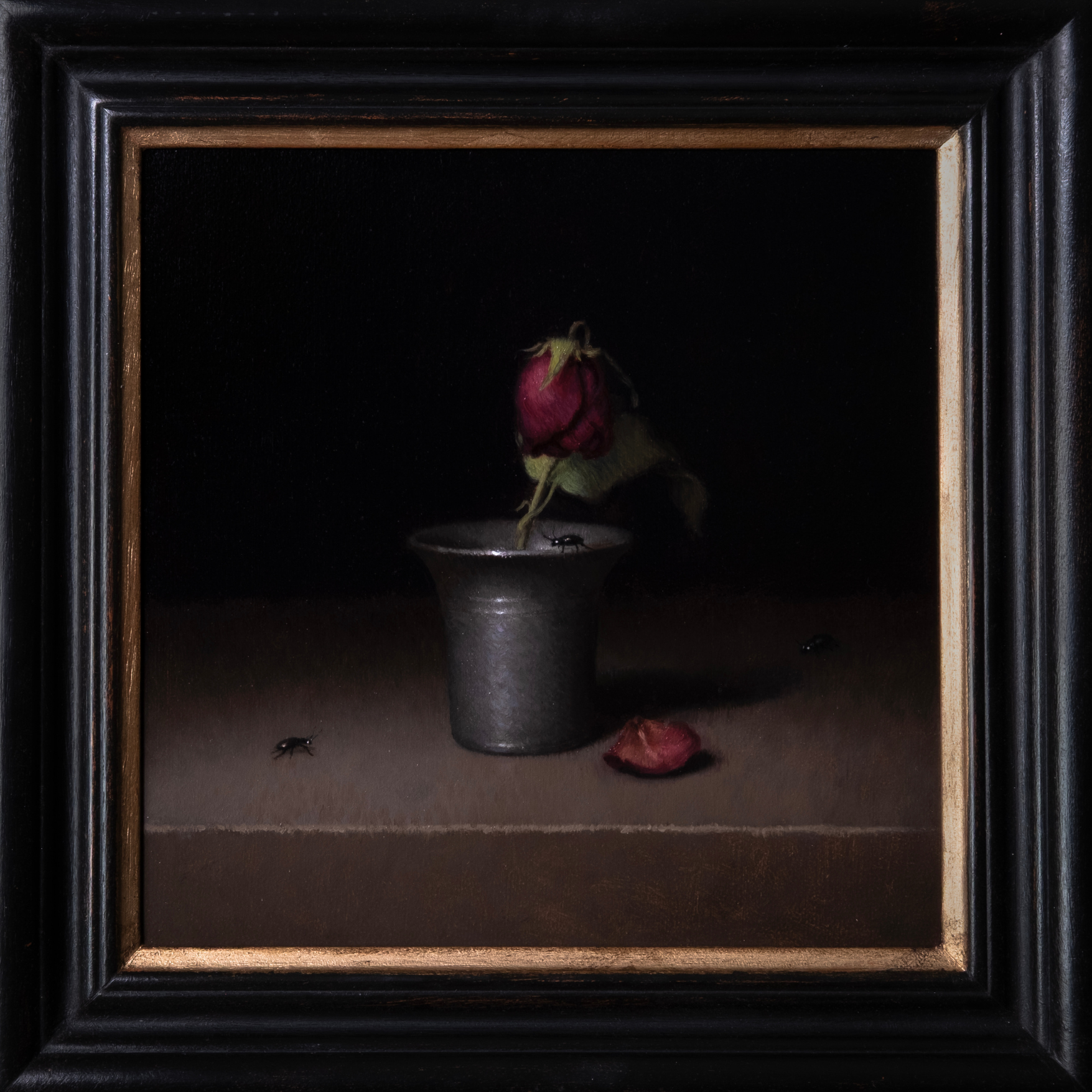 クラシックなブーケのシフォン・ピンクの傍らにある昆虫のペトロール・ブルーの虹色の輝きのように、ROSE WITH INSECTは汚染された牧歌を呼び起こし、完璧が脅かされる微妙なドラマの瞬間をとらえ、その儚さがより一層魅力的になっている...。