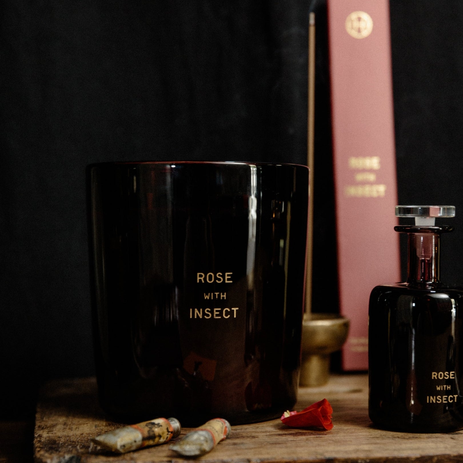 調香師と画家が伝統的なお香を焚くことに共感し、ROSE WITH INSECTを繊細に香らせた。