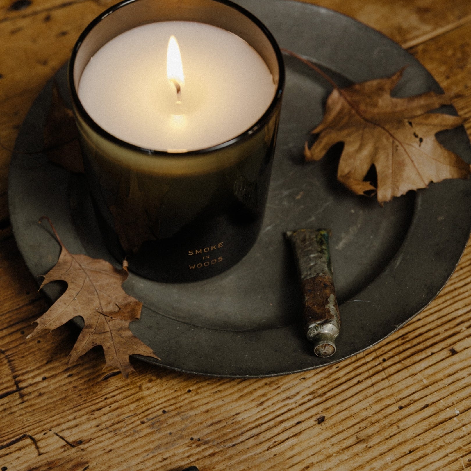 ここでは、象徴的なユーティリティ・キャンドルが、ウィル・カルヴァーの「SMOKE IN WOODS」の絵と呼応するように、金色の葉で飾られている。